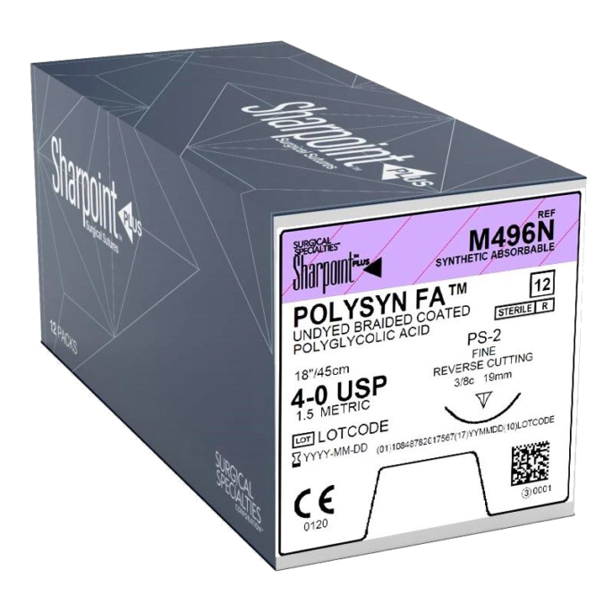 Precision Reverse Cutting; 19mm; 3/8 CirclePolySyn FA4-045cmUndyed12ea/bxSingle Arm$104.00Sharpoint Plus M496N Needle Info PS-2
